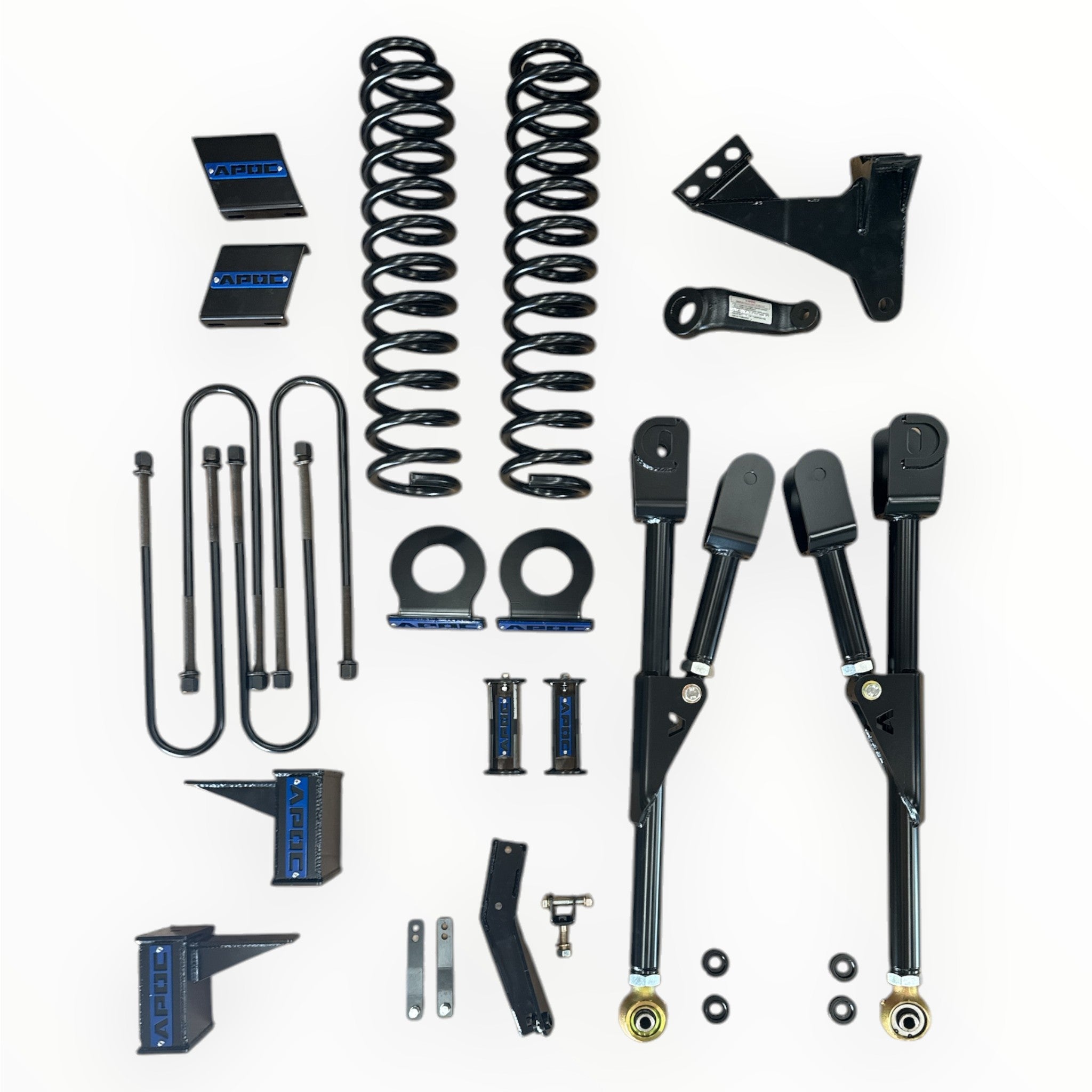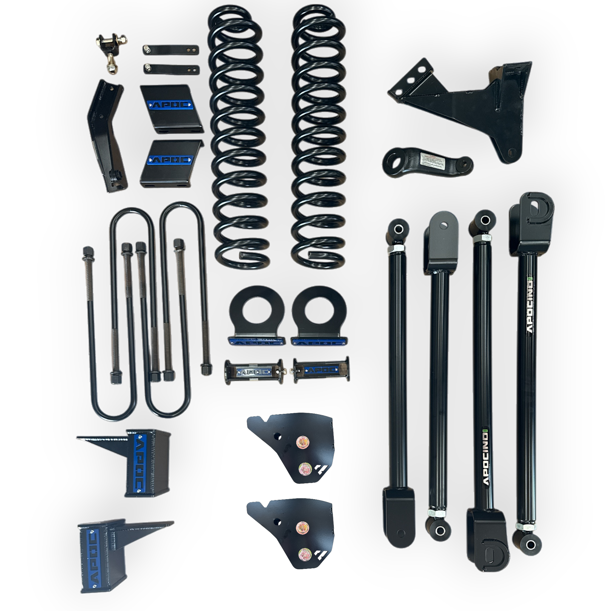 Enhance your Super Duty's performance and appearance with Apoc Industries' 6" lift kit. Designed to maintain optimal suspension geometry, this kit ensures a comfortable, controlled ride on and off the road. The heavy-duty tubular radius arms provide added strength and stability, making it ideal for daily driving, towing, and hauling. Precision-engineered for a seamless fit on 2017–2022 Ford F-250 Super Duty models.