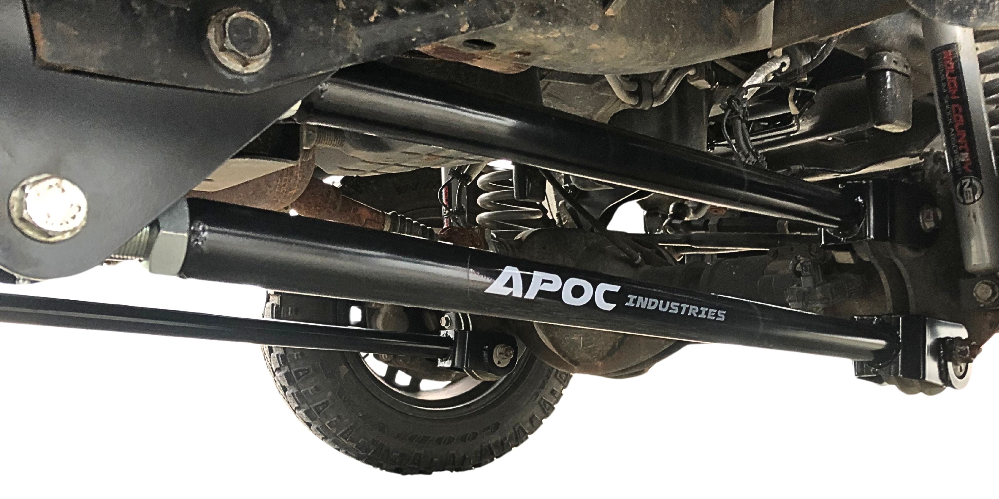 Apoc’s 4-Link Conversion is built for complete suspension control, improved ride quality, and corrected caster angles on lifted trucks. Each kit includes two heavy-duty frame brackets that mount directly into the factory radius arm locations, requiring only one 1/2" hole drilled per side for installation. The kit comes with a full set of extended-length control arms—two uppers and two lowers—fully assembled and ready to install. Lower arms are bent for added tire clearance, allowing smooth articulation and steering with larger tires. Axle-side hardware is reused, keeping the installation clean and straightforward.